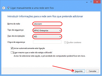 4º passo - Preencher, na janela seguinte, o nome da rede como “eduroam”, selecionar o tipo de segurança como “WPA2-Enterprise” e o tipo de encriptação como “AES”, tal como é apresentado na figura 5, e clicar em “Seguinte”;