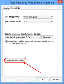10º passo – De volta à janela “Propriedades de Rede sem Fio”, carregar no botão “Definições Avançadas”
