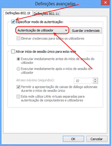 11º passo – Na janela de “Definições Avançadas” colocar um visto na opção “Especificar modo de autenticação” e selecionar “Autenticação de Utilizador” na lista de opções.