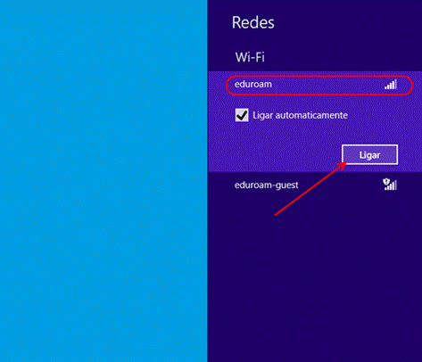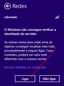 13º passo – Da lista apresentada, selecione a rede “eduroam” e clique no botão Ligar.