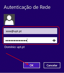 14º passo - Na janela que aparece, inserir como Nome de utilizador o “número de aluno” (ou sigla identificadora utilizada nos computadores dos laboratórios de informática/moodle), no formato “número_de_aluno@upt.pt”/”sigla_identificadora@upt.pt”, e como palavra-passe a que escolheu na matrícula ou a que utiliza para aceder aos computadores dos laboratórios/moodle. De seguida clicar em “OK”.